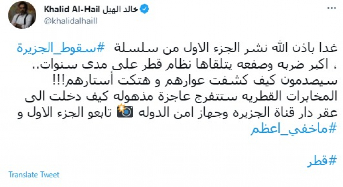 وقال في تغريدة عبر "تويتر" رصدها "المشهد العربي": "غدا بإذن الله نشر الجزء الاول من سلسلة سقوط الجزيرة، أكبر ضربة وصفعة يتلقاها نظام قطر على مدى سنوات.. سيصدمون كيف كشفت عوارهم وهتكت أستارهم".