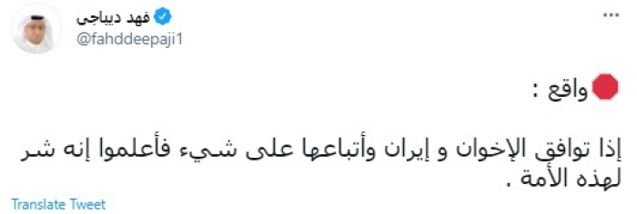 وقال في تغريدة عبر "تويتر" رصدها "المشهد العربي": "إذا توافق الإخوان وإيران وأتباعها على شيء فأعلموا إنه شر لهذه الأمة".