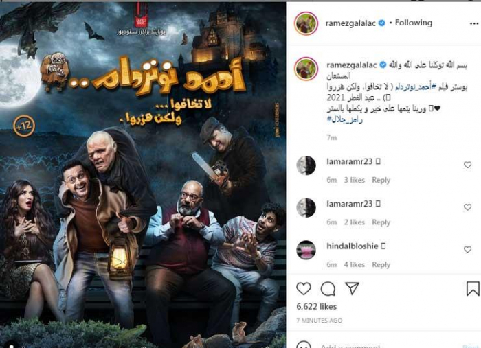 ونشر رامز البوستر، عبر حسابه الرسمي بموقع "إنستجرام"، علق :"بسم الله توكلنا على الله، الله المستعان، بوستر فيلم أحمد نوتردام، لا تخافوا ولكن هزروا، عيد الفطر 2021".