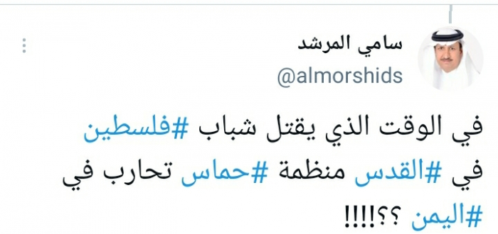 واعتبر في تغريدة على حسابه بموقع التدوين المصغر تويتر، اليوم أنه: "في الوقت الذي يقتل شباب فلسطين في القدس منظمة حماس تحارب في اليمن".