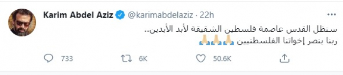 وغرد "عبدالعزيز"، عبر حسابه بموقع "تويتر": "ستظل القدس عاصمة فلسطين الشقيقة لأبد الآبدين، ربنا ينصر إخواتنا الفلسطينيين".
