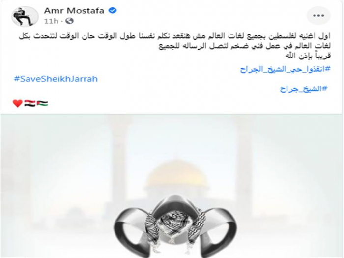 وكتب مصطفى، عبر صفحته بموقع "فيسبوك": "أول أغنية لفلسطين بجميع لغات العالم، مش هنقعد نكلم نفسنا طول الوقت، حان الوقت لنتحدث بكل لغات العالم في عمل فني ضخم لتصل الرسالة للجميع.. قريباً بإذن الله.. انقذوا حي الشيخ الجراح".
