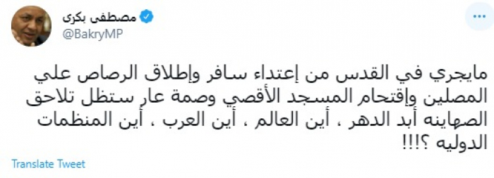 وكتب في تغريدة عبر "تويتر" رصدها "المشهد العربي": "ما يجري في القدس من إعتداء سافر وإطلاق الرصاص علي المصلين وإقتحام المسجد الأقصي وصمة عار ستظل تلاحق الصهاينة أبد الدهر، أين العالم، أين العرب، أين المنظمات الدولية؟".