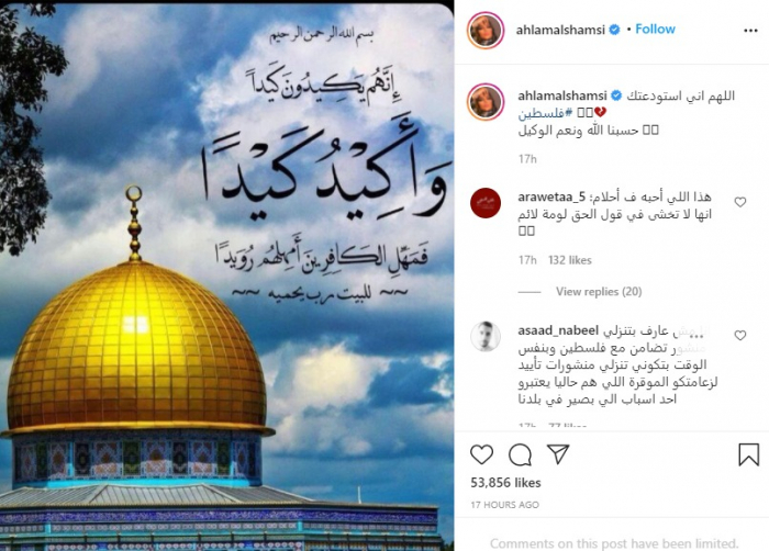 ونشرت أحلام، عبر حسابها على موقع "إنستجرام"، صورة للمسجد الأقصى، مدون عليها قوله تعالى: "إِنَّهُمْ يَكِيدُونَ كَيْداً* وَأَكِيدُ كَيْداً* فَمَهِّلِ الْكَافِرِينَ أَمْهِلْهُمْ رُوَيْداً".