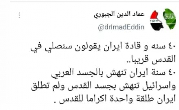 وقال في تغريدة عبر "تويتر" رصدها "المشهد العربي": "40 سنه و قادة أيران يقولون سنصلي في القدس قريبا 40 سنة إيران تنهش بالجسد العربي واسرائيل تنهش بجسد القدس ولم تطلق إيران طلقة واحدة اكراما للقدس".