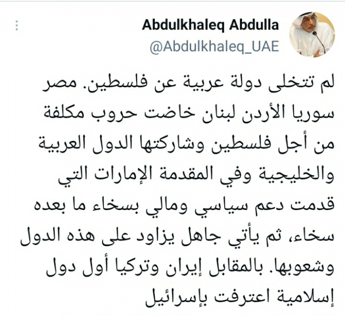 أكد الأكاديمي الإماراتي عبدالخالق عبدالله، أن الدول العربية لم تتخل عن القضية الفلسطينية، موضحا أن الإمارات توفر دعما سياسيا وماليا سخيا لفلسطين.