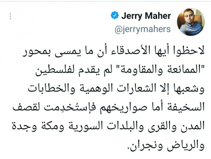 قال الكاتب الصحفي اللبناني جيري ماهر، إن محور المقاومة، لا يقدم إلى القضية الفلسطينية إلا الشعارات الوهمية.
