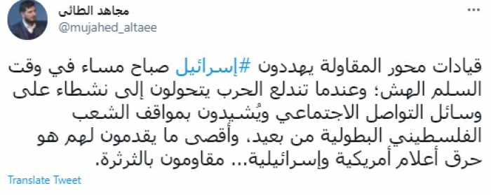 وقال في تغريدة عبر "تويتر" رصدها "المشهد العربي": "قيادات محور المقاولة يهددون إسرائيل صباح مساء في وقت السلم الهش؛ وعندما تندلع الحرب يتحولون إلى نشطاء على وسائل التواصل الاجتماعي ويُشيدون بمواقف الشعب الفلسطيني البطولية من بعيد، وأقصى ما يقدمون لهم هو حرق أعلام أمريكية وإسرائيلية... مقاومون بالثرثرة".