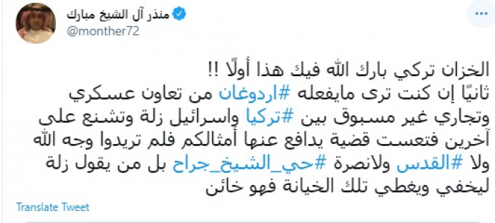 وكتب في تغريدة عبر "تويتر" رصدها "المشهد العربي": "الخزان تركي بارك الله فيك هذا أولًا.. ثانيًا إن كنت ترى ما يفعله أردوغان من تعاون عسكري وتجاري غير مسبوق بين تركيا واسرائيل زلة وتشنع على آخرين فتعست قضية يدافع عنها أمثالكم فلم تريدوا وجه الله ولا القدس ولانصرة حي الشيخ جراح بل من يقول زلة ليخفي ويغطي تلك الخيانة فهو خائن".