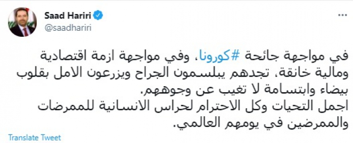 وجه رئيس الوزراء اللبناني المكلف سعد الحريري، اليوم، رسالة هامة للممرضين والممرضات في يومهم العالمي.