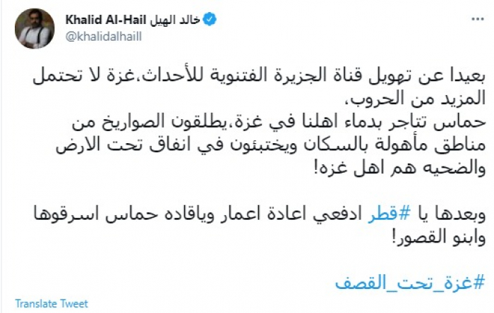 وكتب في تغريدة عبر "تويتر" رصدها "المشهد العربي": "بعيدا عن تهويل قناة الجزيرة الفتنوية للأحداث،غزة لا تحتمل المزيد من الحروب، حماس تتاجر بدماء أهلنا في غزة، يطلقون الصواريخ من مناطق مأهولة بالسكان ويختبئون في انفاق تحت الأرض والضحيه هم أهل غزة".