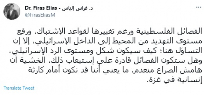 وقال في تغريدة عبر "تويتر" رصدها "المشهد العربي": "الفصائل الفلسطينية ورغم تغييرها لقواعد الإشتباك، ورفع مستوى التهديد من المحيط إلى الداخل الإسرائيلي، إلا إن التساؤل هنا؛ كيف سيكون شكل ومستوى الرد الإسرائيلي".