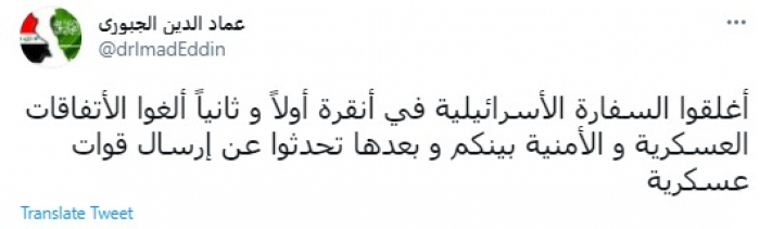 وقال في تغريدة عبر "تويتر" رصدها "المشهد العربي": "أغلقوا السفارة الأسرائيلية في أنقرة أولاً وثانياً ألغوا الاتفاقات العسكرية والأمنية بينكم وبعدها تحدثوا عن إرسال قوات عسكرية".