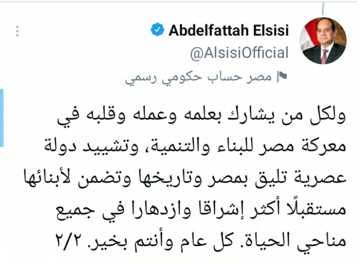 وأضاف أنه: "في هذه المناسبة المباركة، أنتهز الفرصة كي أتقدم بتحية إجلال وتقدير لرجال ونساء وشباب مصر المخلصين ولكل من يشارك بعلمه وعمله وقلبه في معركة مصر للبناء والتنمية، وتشييد دولة عصرية تليق بمصر وتاريخها وتضمن لأبنائها مستقبلًا أكثر إشراقا وازدهارا في جميع مناحي الحياة"، مختتما: "كل عام وأنتم بخير".