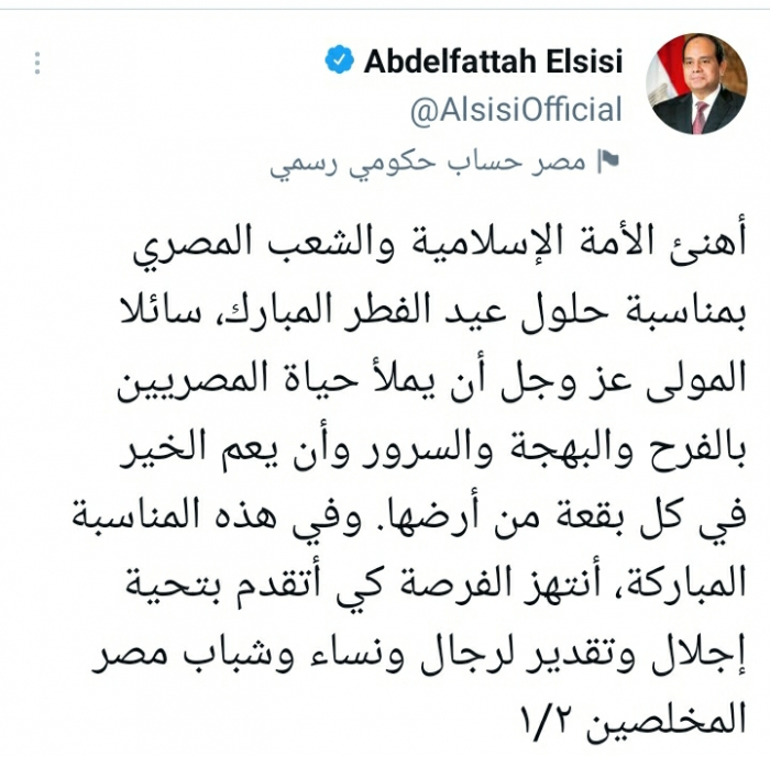 وقال في تغريدة على حسابه بموقع التدوين المصغر تويتر، اليوم إني: "أهنئ الأمة الإسلامية والشعب المصري بمناسبة حلول عيد الفطر المبارك".