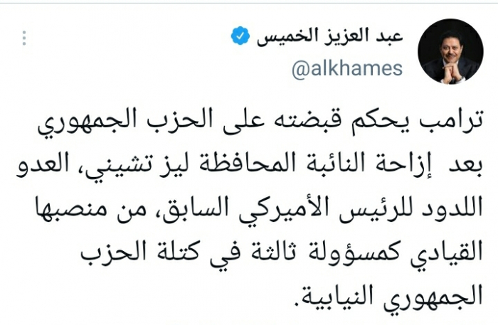 أكد الكاتب الصحفي عبدالعزيز الخميس، أن الرئيس الأمريكي السابق دونالد ترامب، أحكم سيطرته على الحزب الجمهوري بعد إبعاد النائبة المحافظة ليز تشيني من منصبها.