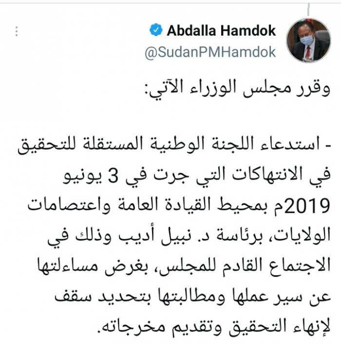 وأوضح أنه: "قرر مجلس الوزراء الآتي: "استدعاء اللجنة الوطنية المستقلة للتحقيق في الانتهاكات التي جرت في 3 يونيو 2019م بمحيط القيادة العامة واعتصامات الولايات، برئاسة د. نبيل أديب وذلك في الاجتماع القادم للمجلس، بغرض مساءلتها عن سير عملها ومطالبتها بتحديد سقف لإنهاء التحقيق وتقديم مخرجاته".