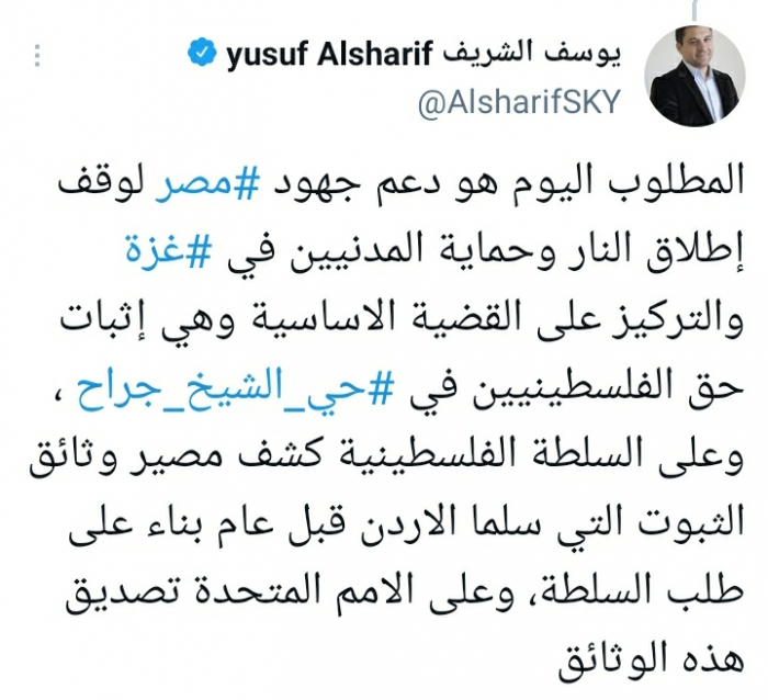 طالب الكاتب الصحفي يوسف الشريف، بمساندة الجهود المصرية الدبلوماسية لوقف النار في غزة، ودعم حق الفلسطينيين في حي الشيخ جراح.