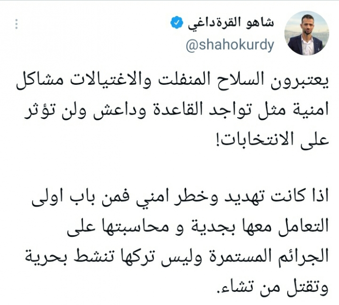 وأشار في تغريدة على حسابه بموقع التدوين المصغر تويتر، اليوم إلى أنهم: "يعتبرون السلاح المنفلت والاغتيالات مشاكل أمنية مثل تواجد القاعدة وداعش ولن تؤثر على الانتخابات!".