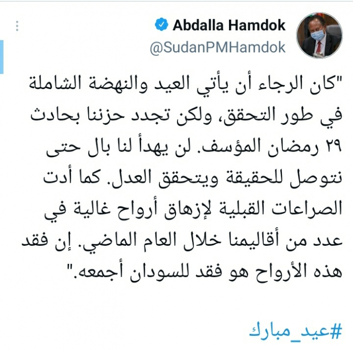 وشدد رئيس الوزراء السوداني على أن: "فقد هذه الأرواح هو فقد للسودان أجمعه."