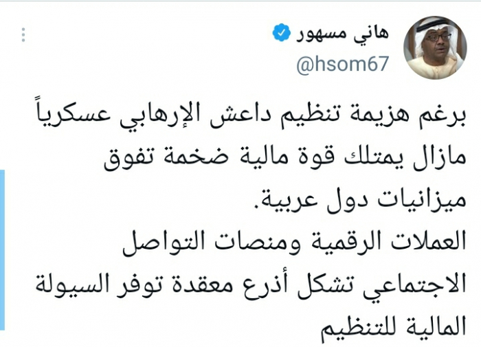وأشار في تغريدة على حسابه بموقع التدوين المصغر تويتر، اليوم إلى أنه: "برغم هزيمة تنظيم داعش الإرهابي عسكرياً ما زال يمتلك قوة مالية ضخمة تفوق ميزانيات دول عربية".