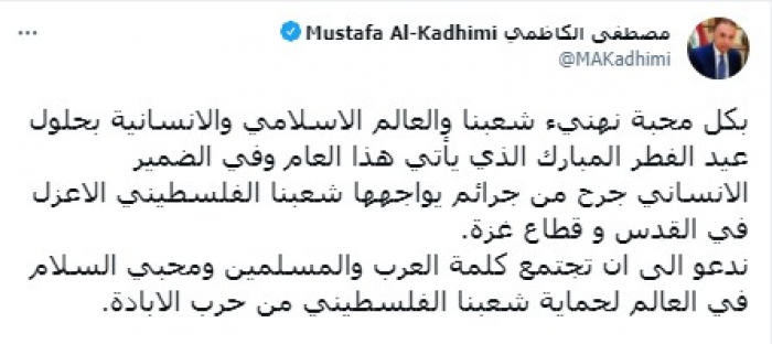 عبر رئيس وزراء العراق مصطفى الكاظمي عن تهانيه للأمة الإسلامية بحلول عيد الفطر المبارك، مطالبا العرب ومحبي السلام بحماية الشعب الفلسطيني.