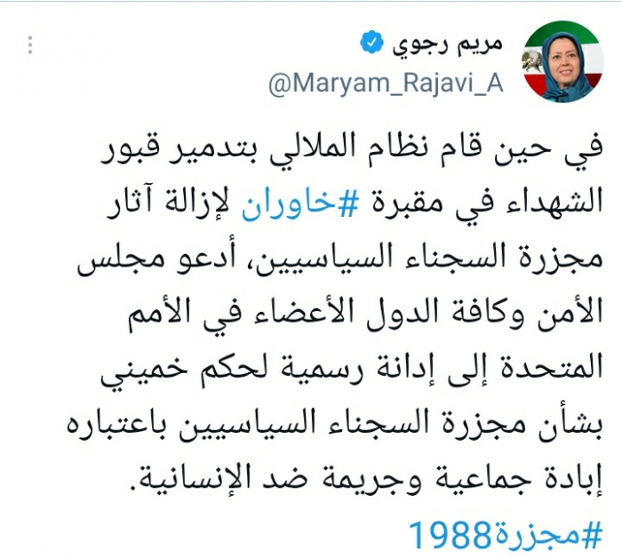 وأوضحت في تغريدة على حسابها بموقع التدوين المصغر تويتر، اليوم أنه: "في حين قام نظام الملالي بتدمير قبور الشهداء في مقبرة خاوران لإزالة آثار مجزرة السجناء السياسيين، أدعو مجلس الأمن وكافة الدول الأعضاء في الأمم المتحدة إلى إدانة رسمية لحكم خميني بشأن مجزرة السجناء السياسيين باعتباره إبادة جماعية وجريمة ضد الإنسانية"، مختتمة بهاشتاج: "مجزرة 1988".