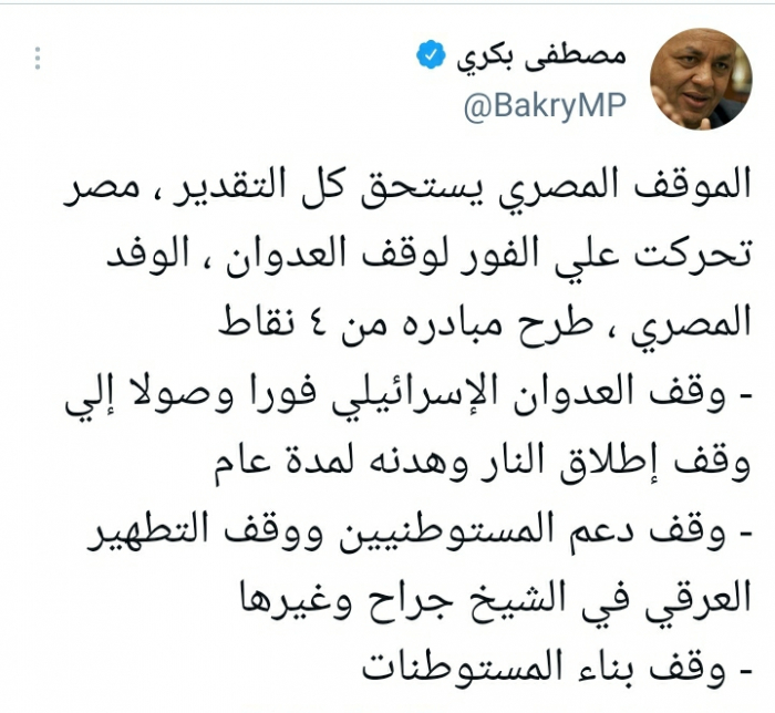 أشاد الإعلامي والبرلماني مصطفى بكري بجهود مصر لوقف العدوان على فلسطين، كاشفا عن مبادرة من 4 نقاط.