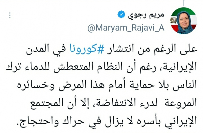 ورأت في تغريدة على حسابها بموقع التدوين المصغر تويتر، اليوم أنه: "على الرغم من انتشار كورونا في المدن الإيرانية، رغم أن النظام المتعطش للدماء ترك الناس بلا حماية أمام هذا المرض وخسائره المروعة لدرء الانتفاضة، إلا أن المجتمع الإيراني بأسره لا يزال في حراك واحتجاج".