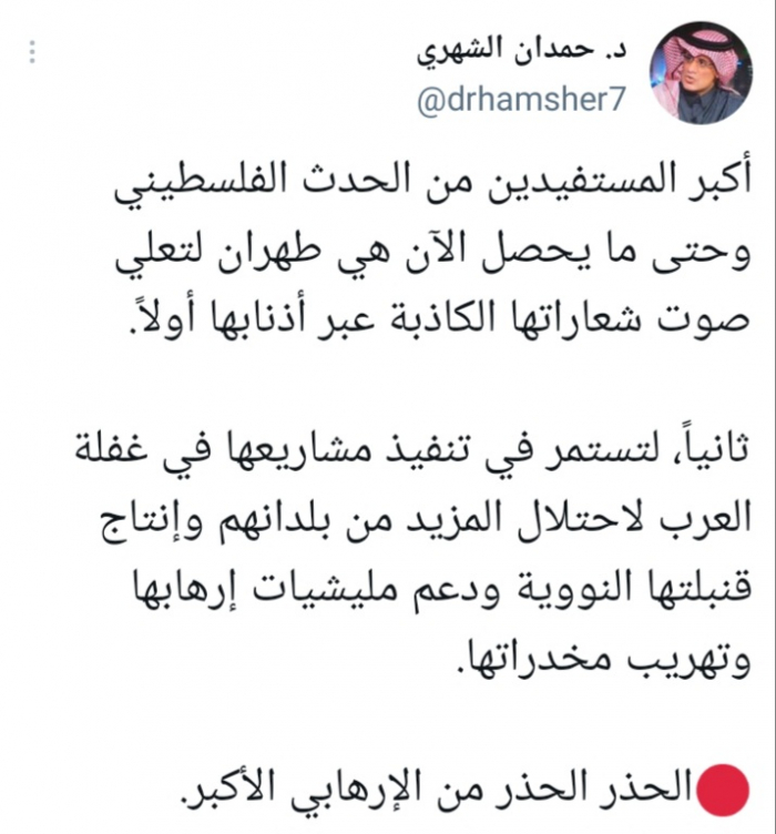 وأشار في تغريدة على حسابه بموقع التدوين المصغر تويتر، اليوم إلى أن: "أكبر المستفيدين من الحدث الفلسطيني وحتى ما يحصل الآن هي طهران لتعلي صوت شعاراتها الكاذبة عبر أذنابها أولاً".