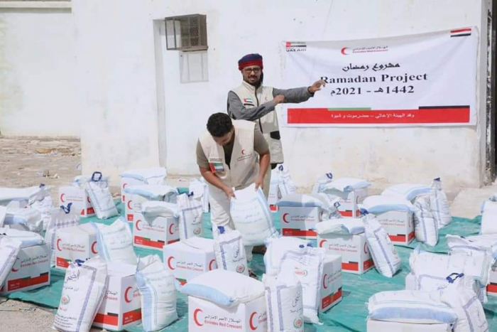 وزعت هيئة الهلال الأحمر الإماراتية، خلال شهر رمضان المبارك، خمسة آلاف سلة غذائية على المستحقين في محافظتي حضرموت وشبوة، ضمن برنامجها الرمضاني.
