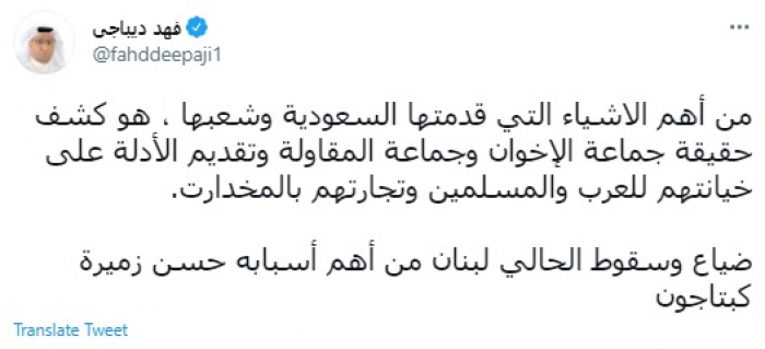 وكتب في تغريدة عبر "تويتر" رصدها "المشهد العربي": "من أهم الاشياء التي قدمتها السعودية وشعبها ، هو كشف حقيقة جماعة الإخوان وجماعة المقاولة وتقديم الأدلة على خيانتهم للعرب والمسلمين وتجارتهم بالمخدارت".