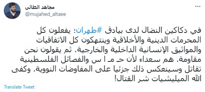 وقال في تغريدة عبر "تويتر" رصدها "المشهد العربي": "في دكاكين النضال لدى بيادق طهران؛ يفعلون كل المحرمات الدينية والأخلاقية وينتهكون كل الاتفاقيات والمواثيق الإنسانية الداخلية والخارجية، ثم يقولون نحن مقاومة. هم سعداء لأن حماس والفصائل الفلسطينية تقاتل وسينعكس ذلك جزئيا على المفاوضات النووية. وكفى الله الميليشيات شر القتال".