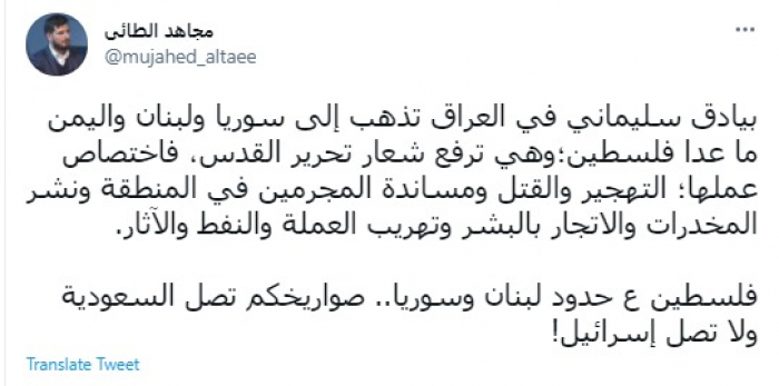 وقال في تغريدة عبر "تويتر" رصدها "المشهد العربي": "بيادق سليماني في العراق تذهب إلى سوريا ولبنان واليمن ما عدا فلسطين؛وهي ترفع شعار تحرير القدس، فاختصاص عملها؛ التهجير والقتل ومساندة المجرمين في المنطقة ونشر المخدرات والاتجار بالبشر وتهريب العملة والنفط والآثار".