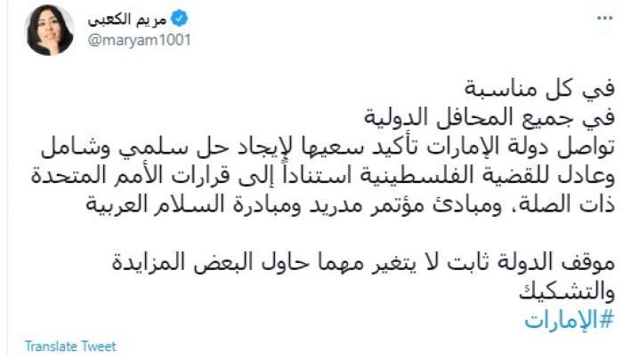 وكتبت في تغريدة عبر "تويتر" رصدها "المشهد العربي": "في كل مناسبة في جميع المحافل الدولية تواصل دولة الإمارات تأكيد سعيها لإيجاد حل سلمي وشامل وعادل للقضية الفلسطينية استناداً إلى قرارات الأمم المتحدة ذات الصلة، ومبادئ مؤتمر مدريد ومبادرة السلام العربية".