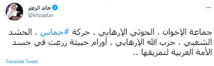 وقال في تغريدة عبر "تويتر" رصدها "المشهد العربي": "جماعة الإخوان، الحوثي الإرهابي، حركة حماس، الحشد الشعبي، حزب الله الإرهابي، أورام خبيثة زرعت في جسد الأمة العربية لتمزيقها".