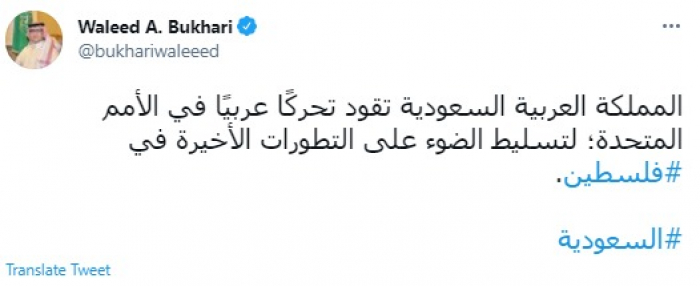 وكتب في تغريدة عبر "تويتر" رصدها "المشهد العربي": "المملكة العربية السعودية تقود تحركًا عربيًا في الأمم المتحدة؛ لتسليط الضوء على التطورات الأخيرة في فلسطين".