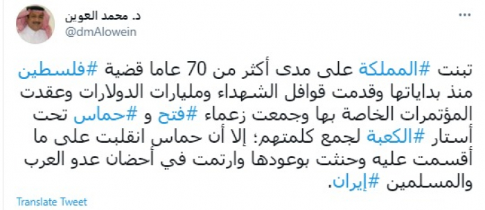 وكتب في تغريدة عبر "تويتر" رصدها "المشهد العربي": "تبنت المملكة على مدى أكثر من 70 عاما قضية فلسطين منذ بداياتها وقدمت قوافل الشهداء ومليارات الدولارات وعقدت المؤتمرات الخاصة بها وجمعت زعماء فتح وحماس تحت أستار الكعبة لجمع كلمتهم؛ إلا أن حماس انقلبت على ما أقسمت عليه وحنثت بوعودها وارتمت في أحضان عدو العرب والمسلمين إيران".
