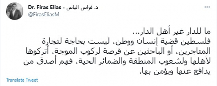 وكتب في تغريدة عبر "تويتر" رصدها "المشهد العربي": "ما للدار غير أهل الدار... فلسطين قضية إنسان ووطن، ليست بحاجة لتجارة المتاجرين، أو الباحثين عن فرصة لركوب الموجة، أتركوها لأهلها ولشعوب المنطقة والضمائر الحية، فهم أصدق من يدافع عنها ويؤمن بها".