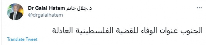 وكتب في تغريدة عبر "تويتر" رصدها "المشهد العربي": "الجنوب عنوان الوفاء للقضية الفلسطينية العادلة".