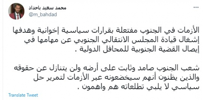 وكتب في تغريدة عبر "تويتر" رصدها "المشهد العربي": "الأزمات في الجنوب مفتعلة بقرارات سياسية إخوانية وهدفها إشغال قيادة المجلس الانتقالي الجنوبي عن مهامها في إيصال القضية الجنوبية للمحافل الدولية".