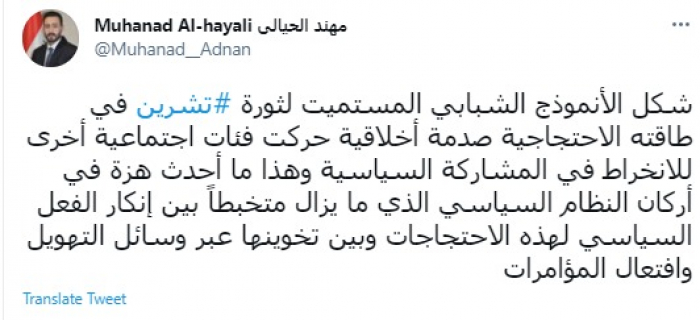 وكتب في تغريدة عبر "تويتر" رصدها "المشهد العربي": "شكل النموذج الشبابي المستميت لثورة تشرين في طاقته الاحتجاجية صدمة أخلاقية حركت فئات اجتماعية أخرى للانخراط في المشاركة السياسية وهذا ما أحدث هزة في أركان النظام السياسي الذي ما يزال متخبطاً بين إنكار الفعل السياسي لهذه الاحتجاجات وبين تخوينها عبر وسائل التهويل وافتعال المؤامرات".