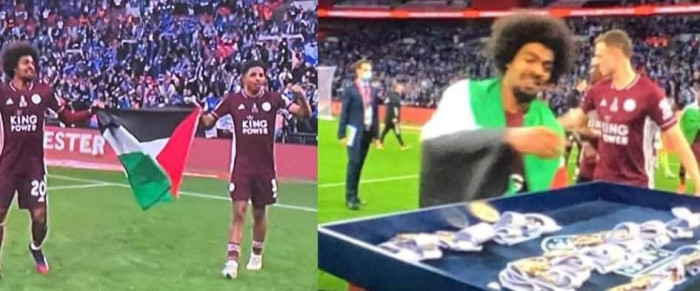 لاعب ليستر سيتي يحتفل بلقب كأس الاتحاد مرتديا علم فلسطين