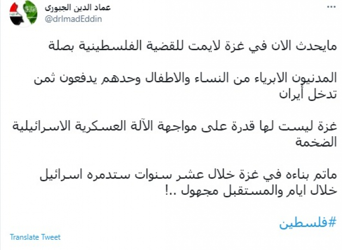 وكتب في تغريدة عبر "تويتر" رصدها "المشهد العربي": "ما يحدث الآن في غزة لا يمت للقضية الفلسطينية بصلة.. المدنيون الأبرياء من النساء والأطفال وحدهم يدفعون ثمن تدخل إيران".