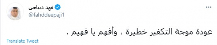وقال في تغريدة عبر "تويتر" رصدها "المشهد العربي": "عودة موجة التكفير خطيرة، وأفهم يا فهيم".