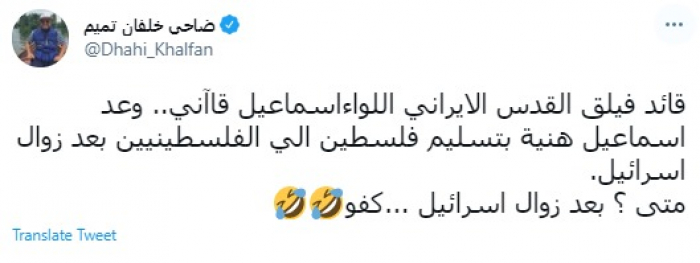وقال في تغريدة عبر "تويتر" رصدها "المشهد العربي": "قائد فيلق القدس الايراني اللواء إسماعيل قاآني.. وعد إسماعيل هنية بتسليم فلسطين إلى الفلسطينيين بعد زوال اسرائيل. متى ؟ بعد زوال اسرائيل".