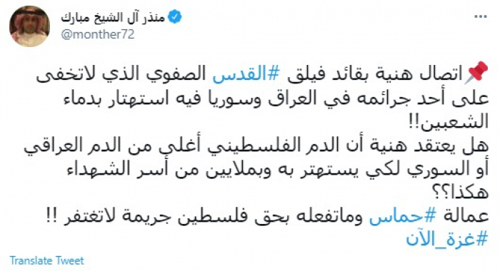 وقال في تغريدة عبر "تويتر" رصدها "المشهد العربي": "اتصال هنية بقائد فيلق القدس الصفوي الذي لا تخفى على أحد جرائمه في العراق وسوريا فيه استهتار بدماء الشعبين".