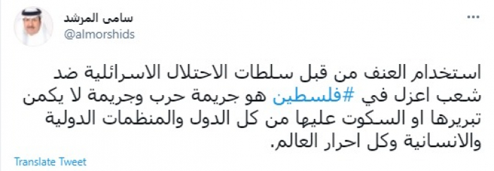 وقال في تغريدة عبر "تويتر" رصدها "المشهد العربي": "استخدام العنف من قبل سلطات الاحتلال الإسرائيلية ضد شعب أعزل في فلسطين هو جريمة حرب وجريمة لا يكمن تبريرها أو السكوت عليها من كل الدول والمنظمات الدولية والانسانية وكل احرار العالم".