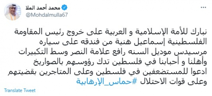 وقال في تغريدة عبر "تويتر" رصدها "المشهد العربي": "نبارك للأمة الإسلامية والعربية على خروج رئيس المقاومة الفلسطينية إسماعيل هنية من فندقه على سيارة مرسيدس موديل السنه رافع علامة النصر وسط التكبيرات وأهلنا وأحبابنا في فلسطين تدك رؤوسهم بالصواريخ".