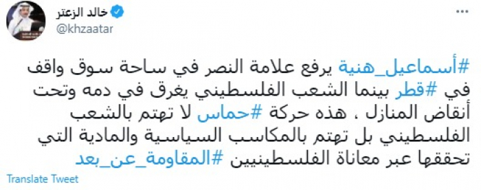 وقال في تغريدة عبر "تويتر" رصدها "المشهد العربي": "إسماعيل هنية يرفع علامة النصر في ساحة سوق واقف في قطر بينما الشعب الفلسطيني يغرق في دمه وتحت أنقاض المنازل".